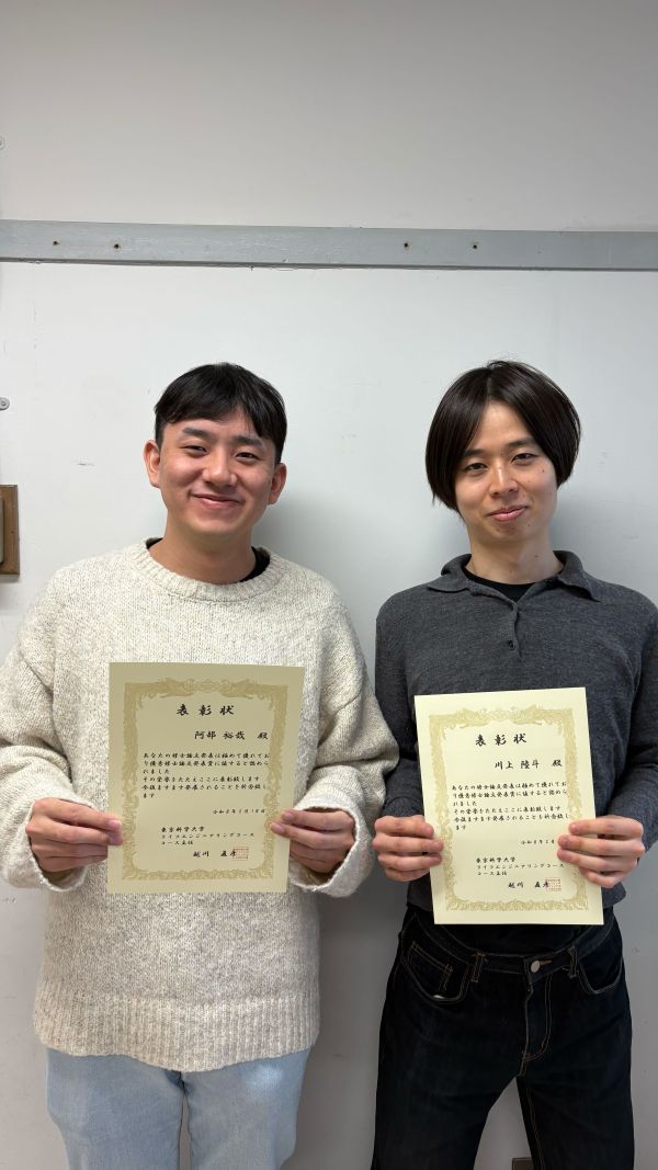 M2の阿部さんと川上さんがライフエンジニアリングコース修士論文発表会にて優秀発表賞を受賞しました!