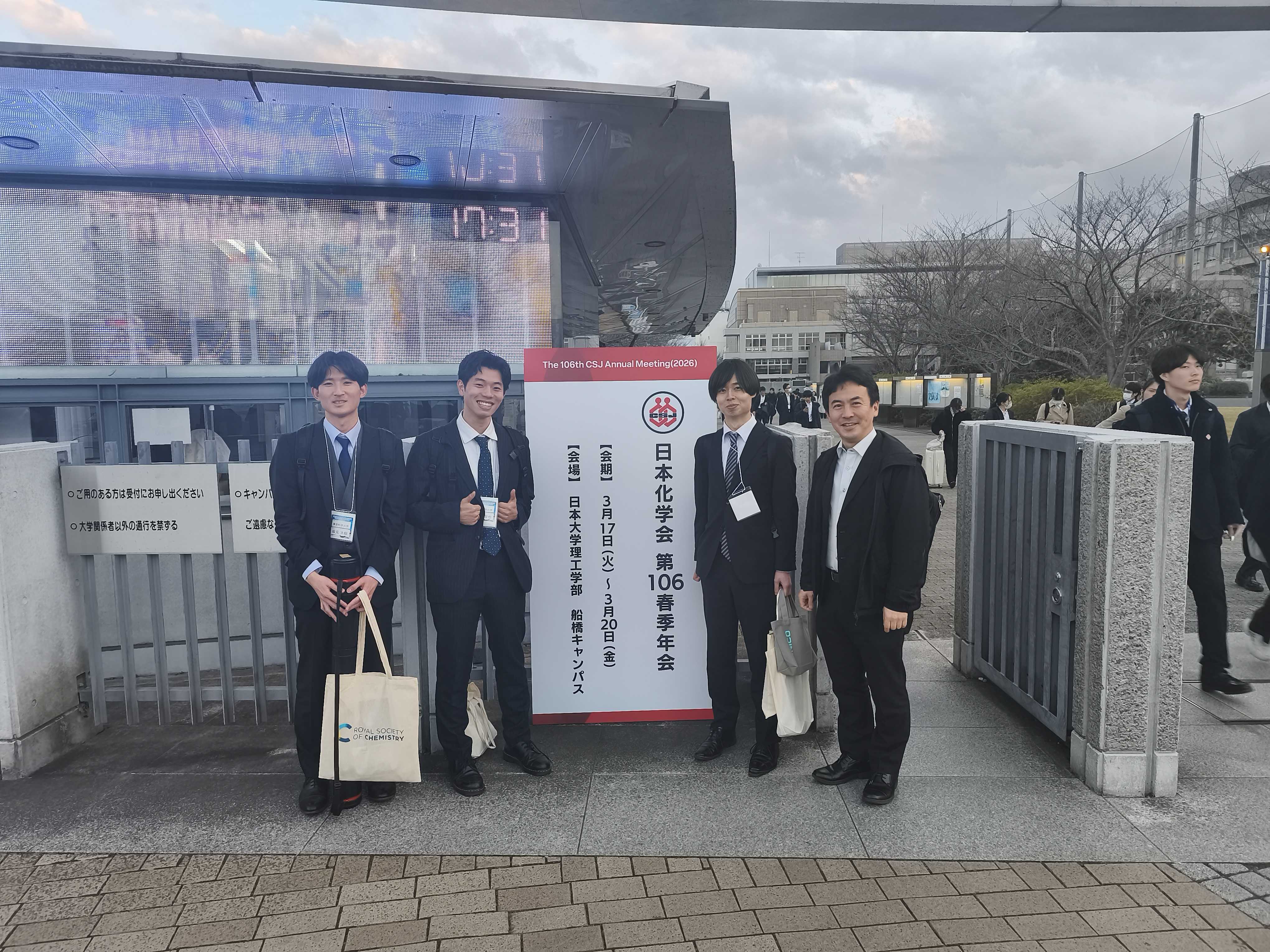 日本大学で開催された日本化学会第106春季年会でM2の川上さん、M1の生田さんが口頭発表を、M1の坂元さんがポスター発表を行いました。